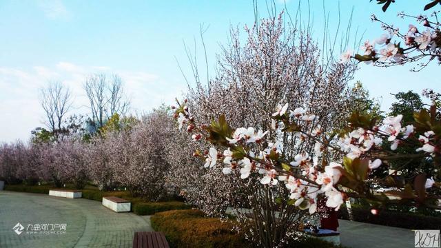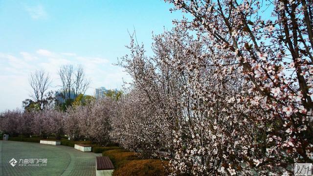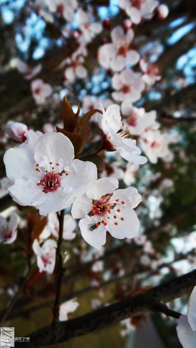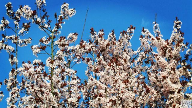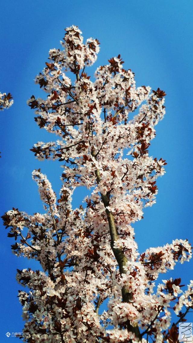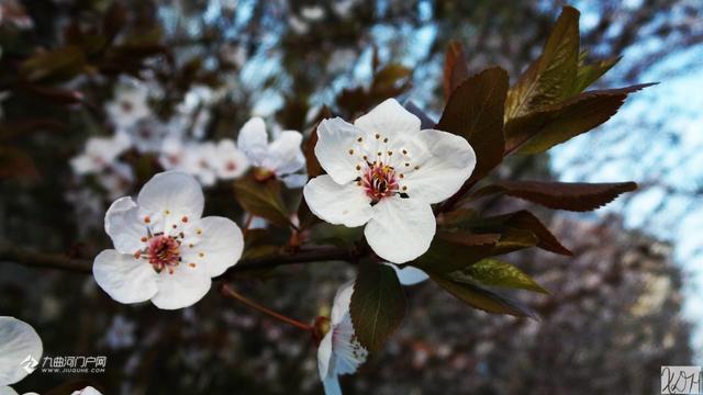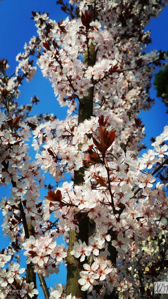 一个阳光明媚的春日,偷得半日闲, 去到沱西景观带拍花花。走着走着,一阵阵花香扑鼻而来。哇,沿途隔不远处都有这种花香,最浓烈的一处是在迎宾大桥(右岸)上游不远处,共有12株(簇)呈弧形排列的树开满了白花,这就是紫叶李花,其叶降红色。