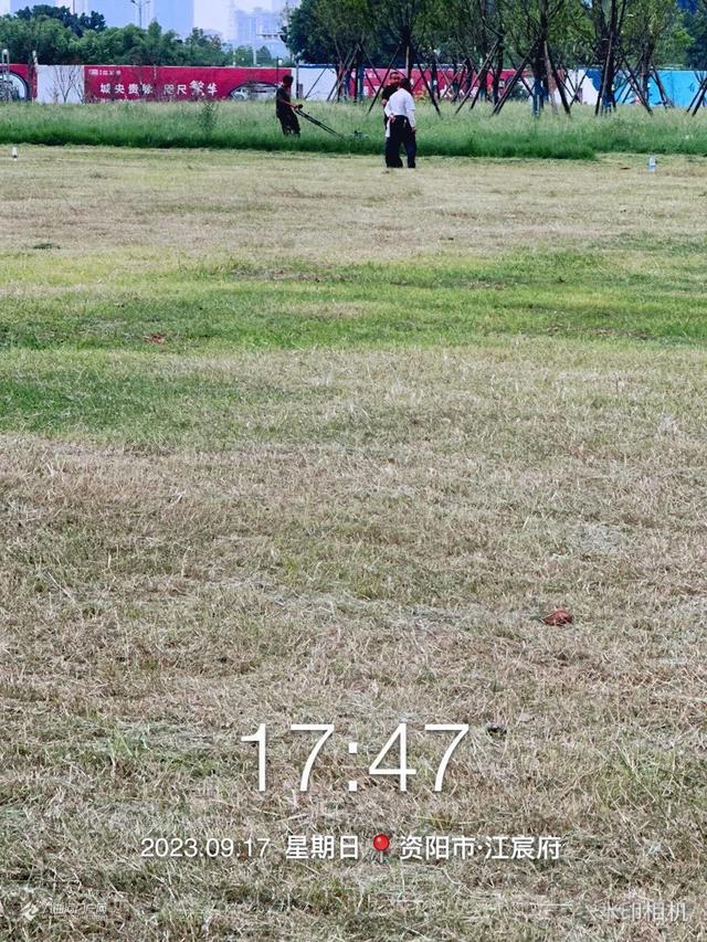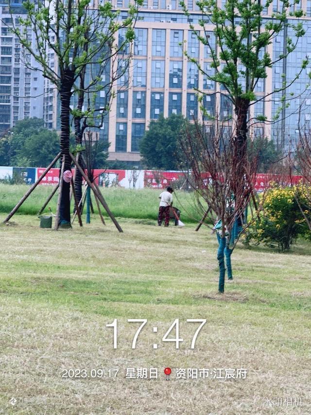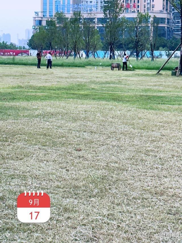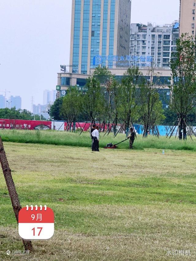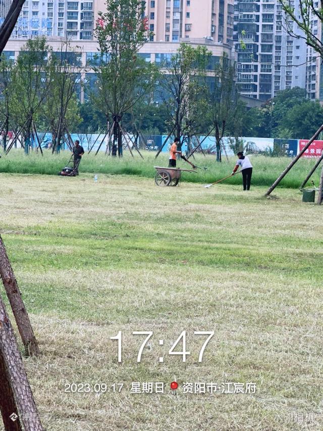 迎接中秋国庆佳节,资阳建工集团的工人正加班加点修剪滨河路西一段市政绿化草坪