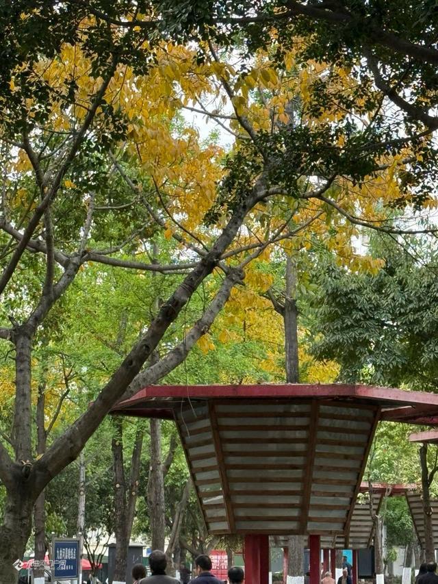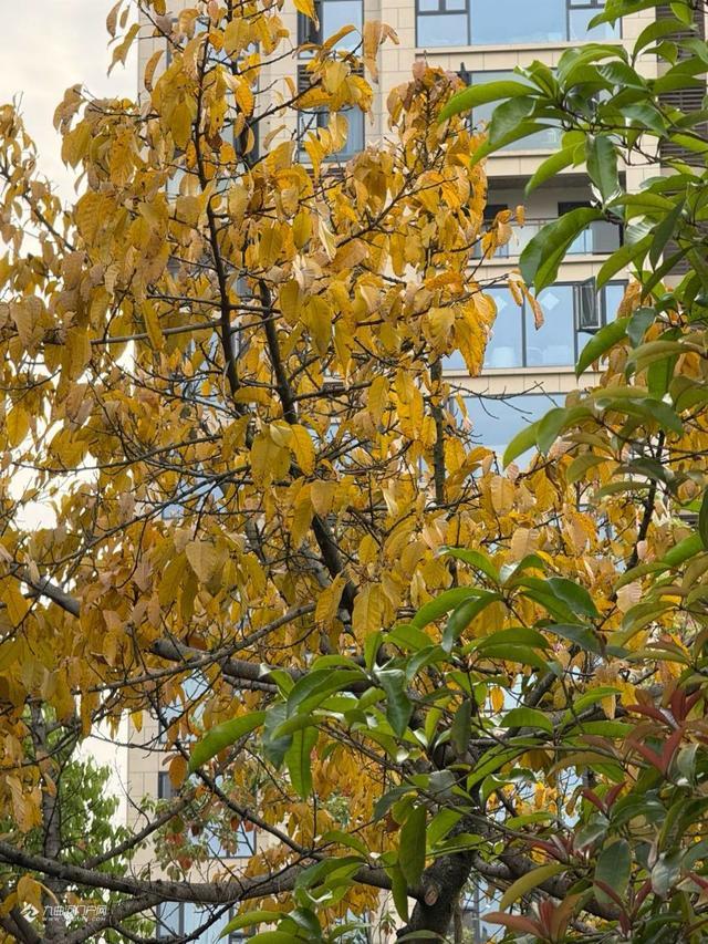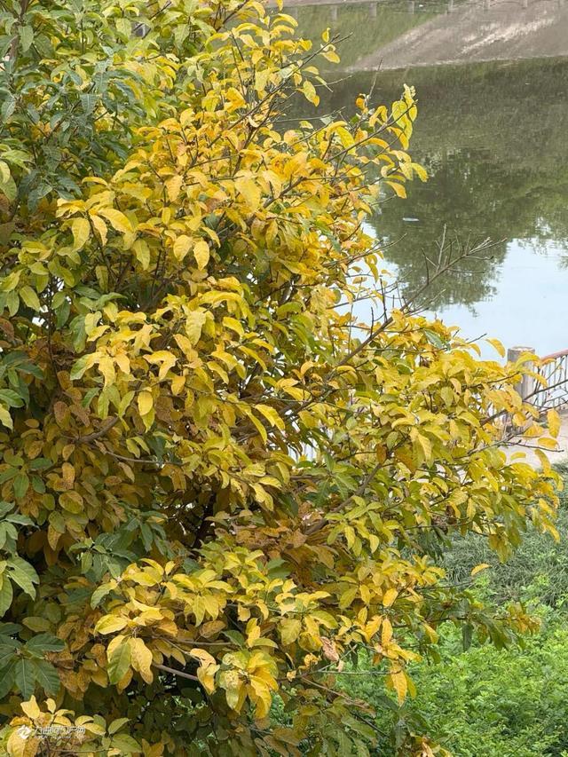 资阳九曲河两岸黄桷树叶黄堪与银杏比美。