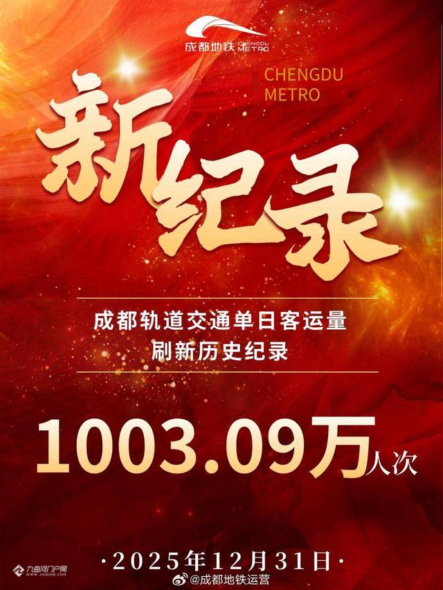 昨日(2025年12月31日),成都地铁单日客运量创历史新高,达到1003.09万人次,这是自2024年12月以来时隔1年再次破纪录!其中,地铁客运量991.20万人次、市域(郊)铁路客运量5.93万人次、有轨电车客运量5.96万人次。