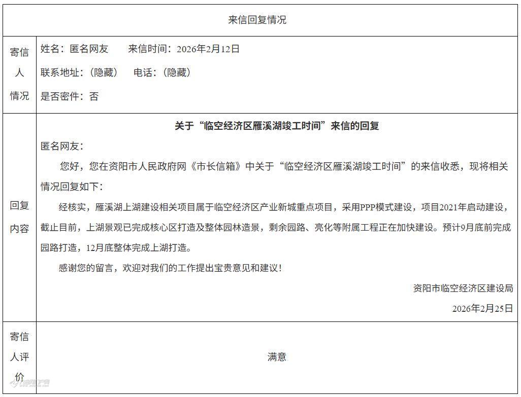 资阳临空经济区雁溪湖什么时候才能竣工?