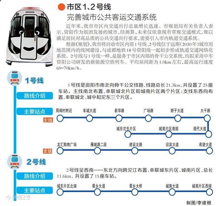 根据《规划》,到2030年,资阳市城市轨道交通线网由3条线路组成,包含成都地铁18号线资阳线和1号线、2号线两条市区线,总长约51公里,设置46座车站。