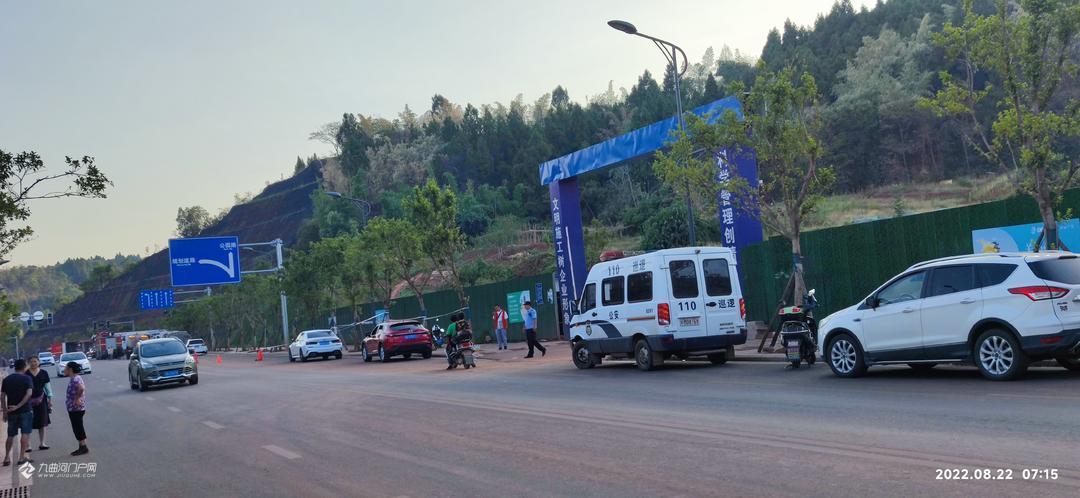 本打算去到火灾现场,看看灭火后的状况。大门口110警车旁边的执勤警官不允许进门。