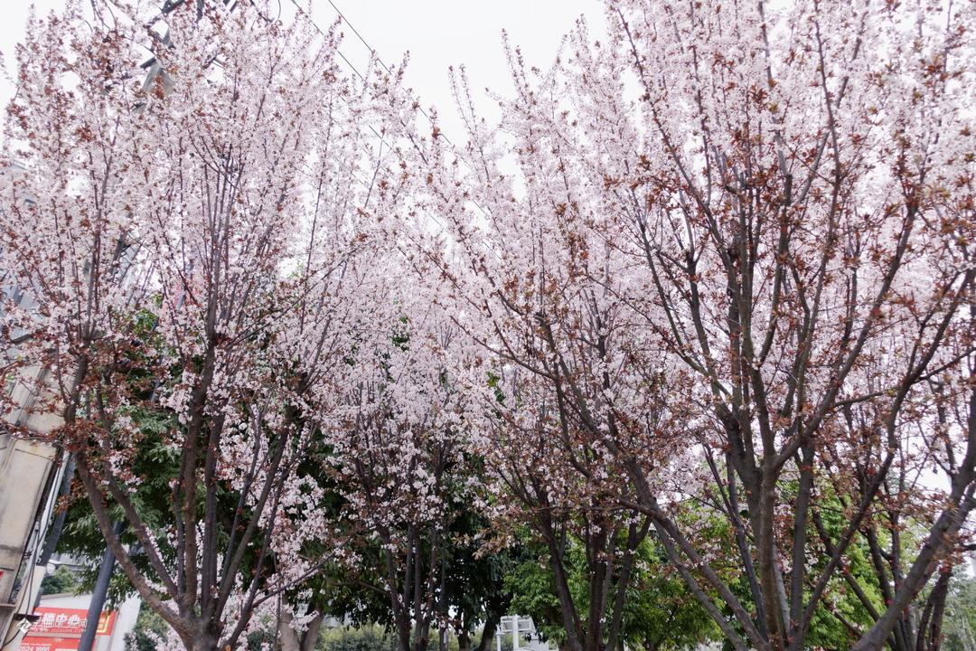 【在资阳晒春天】南骏大道的紫叶李好漂亮!在运动馆外齐刷刷地盛..
