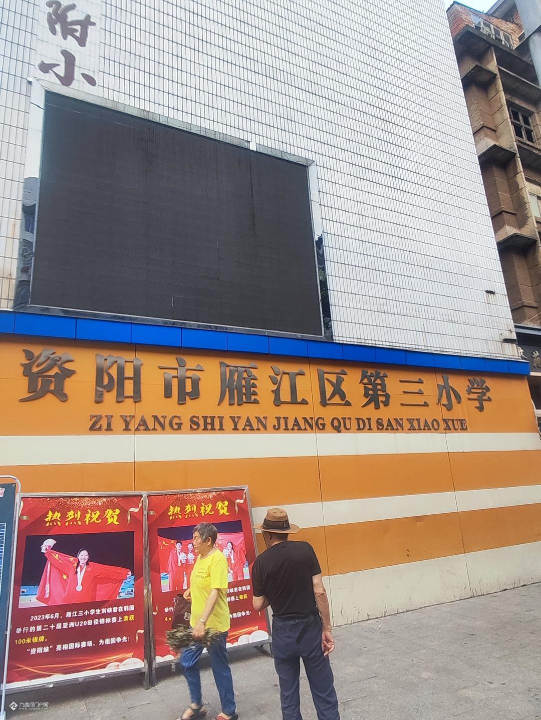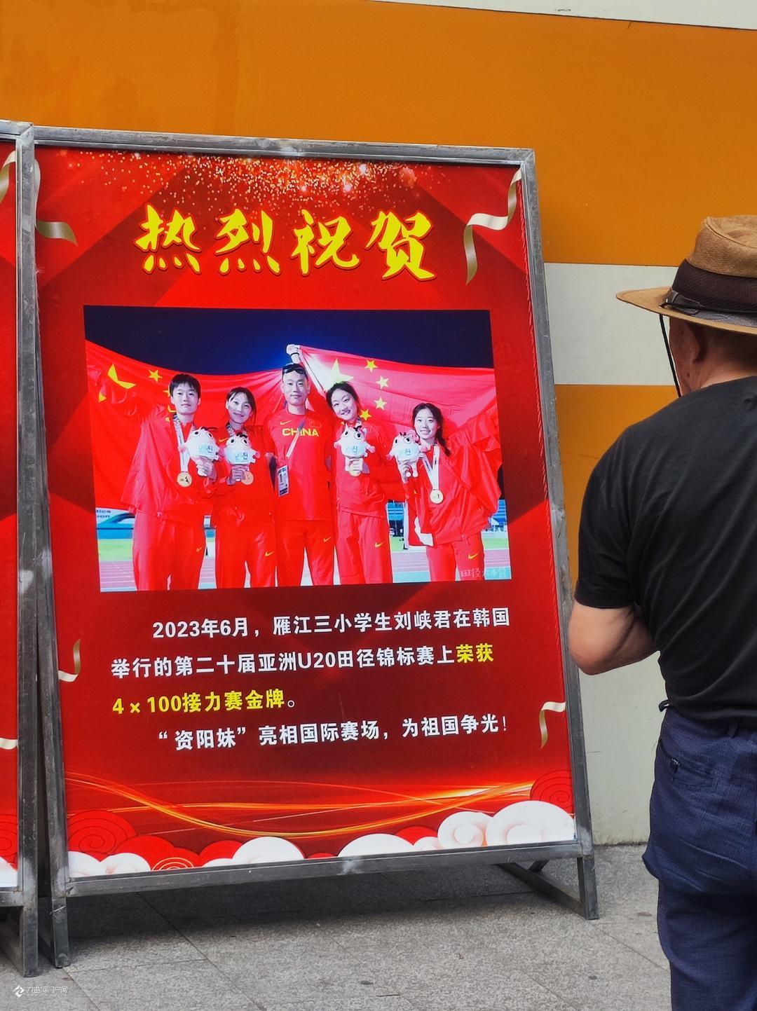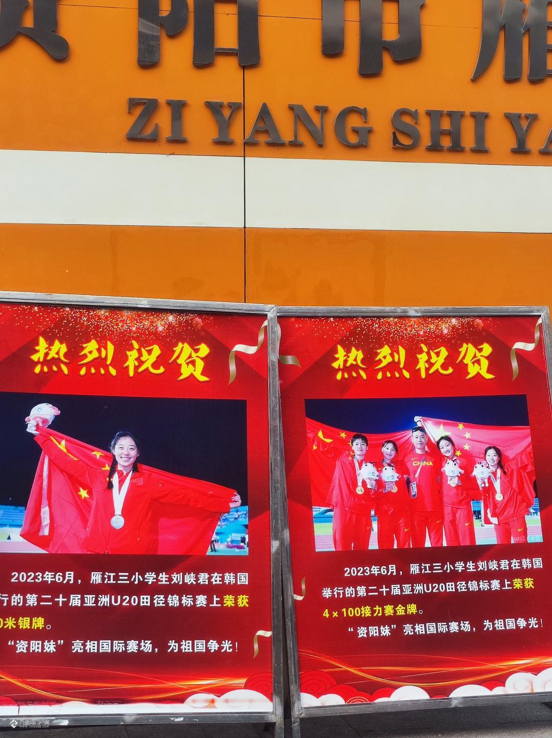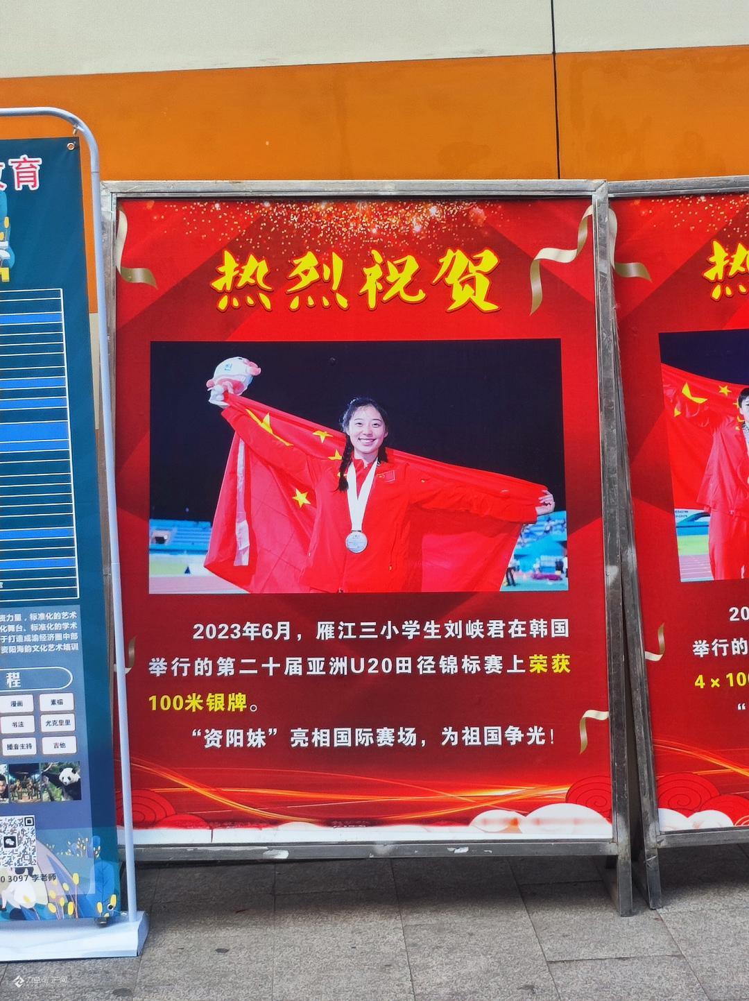 韩国亚青赛赛场上冠军亚军的刘峡君是雁江三小的,学校外面都摆了宣传栏!