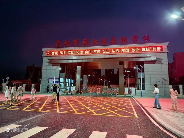 晚饭后散步,马鞍学校初中部外面好热闹,大家都在夸学校修的好。学校外面马路单向通行,路边有停车位,方便家长接送学生。校门右侧有教师停车位,学生自行车停放点雨棚还没盖好,外面设施还在进一步完善中。